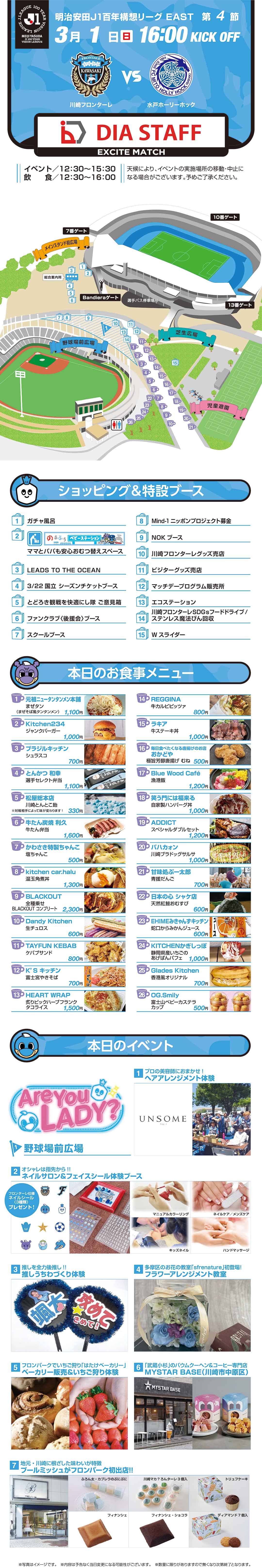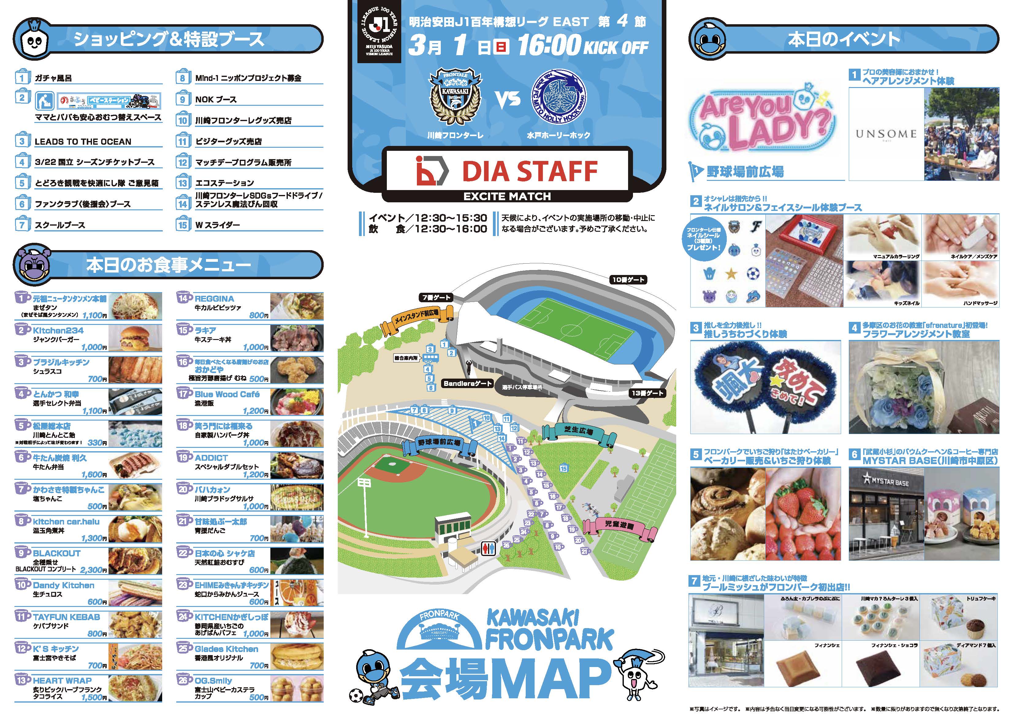 スタジアムには何時から入れますか一般開門はキックオフ時刻の2時間前となります。シーズンチケットをお持ちの方はキックオフ2時間30分前からの先行入場が可能です。キックオフ時刻の3時間30分前から、場外のフロンパークでグルメやアトラクションをお楽しみいただくことができます。