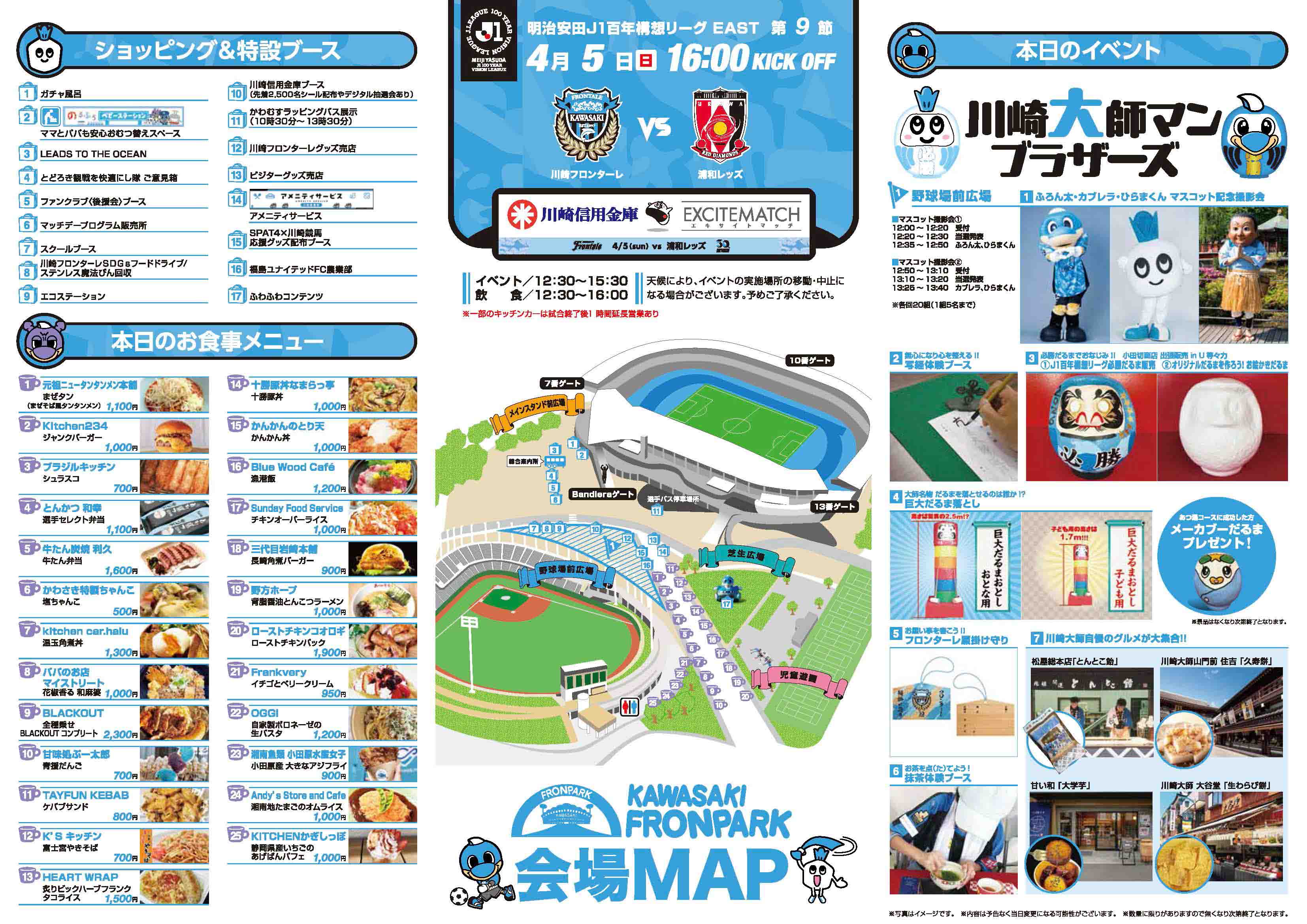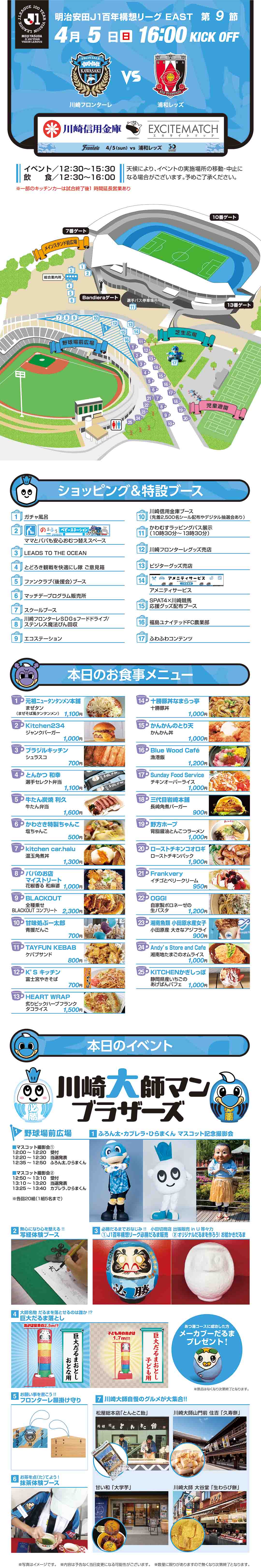スタジアムには何時から入れますか一般開門はキックオフ時刻の2時間前となります。シーズンチケットをお持ちの方はキックオフ2時間30分前からの先行入場が可能です。キックオフ時刻の3時間30分前から、場外のフロンパークでグルメやアトラクションをお楽しみいただくことができます。