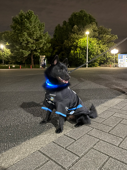 とても元気で首輪もブルーに光らせフロンターレを応援してくれていました!!