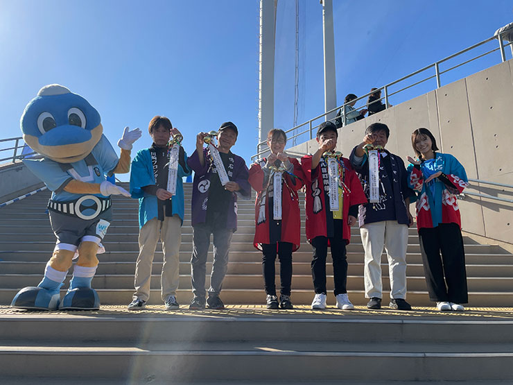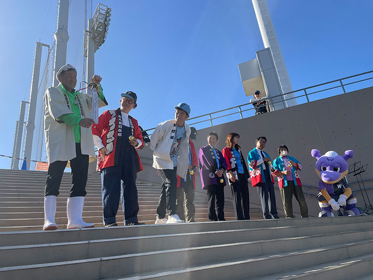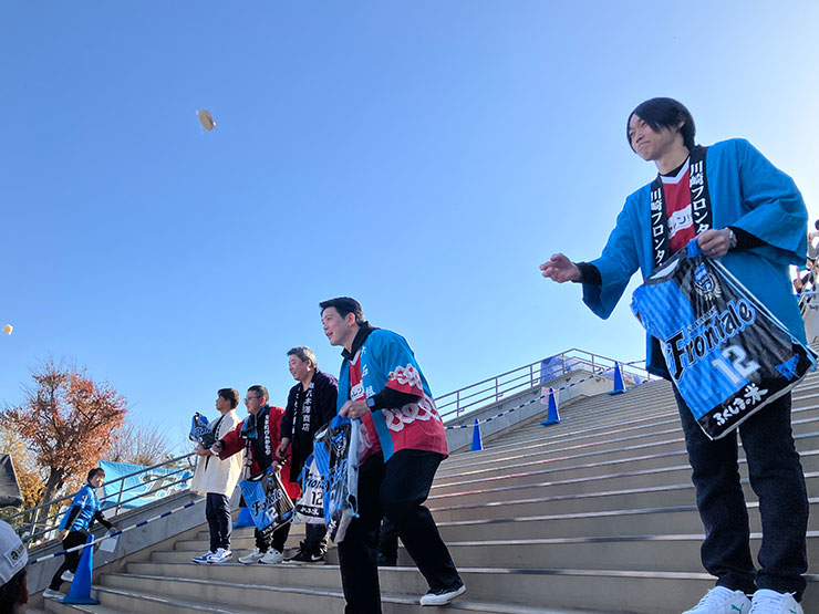 最後の第4回には、陸前高田の皆さんに加えて、川崎フロンターレクラブ特命大使の中西哲生さん、当日「シャレン!で献⾎」イベントのゲストとして来場していたクラブ OB の井川祐輔さんと橋本晃司さんにも参加していただきました。これらの豪華な面々と、今年最後の餅まきということもあり、餅まき会場のボルテージは最高潮に。