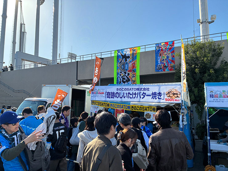 きのこの SATO さんからは三陸海岸の潮風を浴びて育った奇跡のしいたけを冷凍し、そのまま解凍せず凍ったままバターで調理し、塩コショウで味付けをし旨味と香りを倍増させた「奇跡のしいたけバター焼き」の美味しそうなにおいが会場中に広まっていました。この匂いにつられて「バター焼きを食べるまで高田ランドは終えられない」と意気込むスタッフまでいました! 2部を終えた段階で無事にいただくことができ、想像以上のおいしさに心を奪われてしまいました。