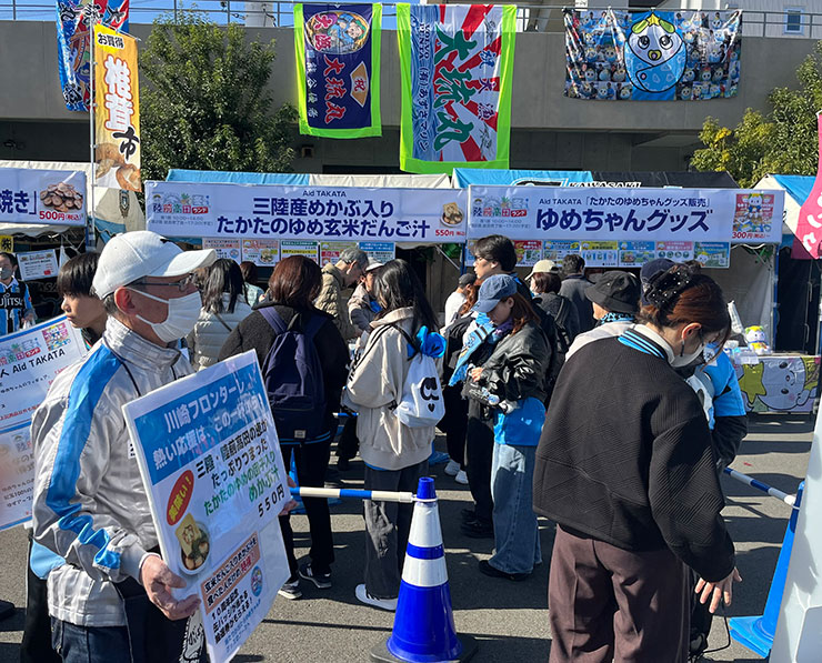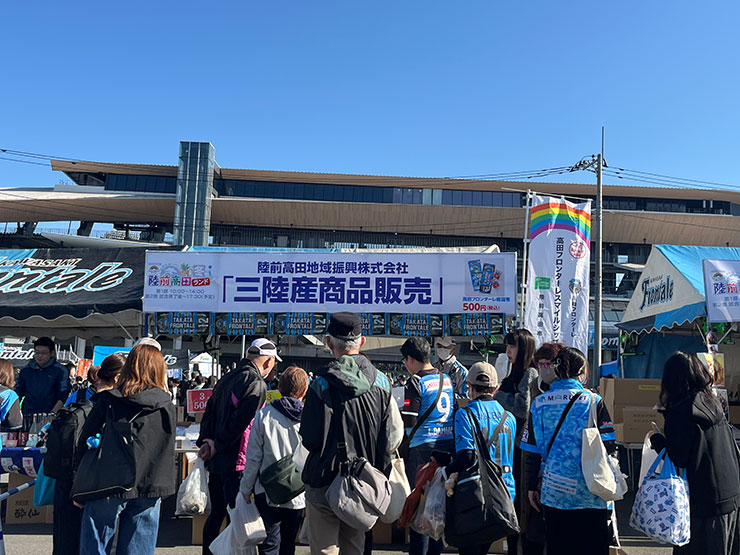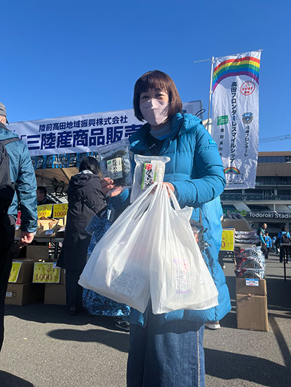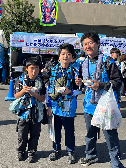 まず、陸前高田地域振興株式会社「三陸産商品販売」では、「たかたのゆめパックご飯」や「高田フロンターレ板昆布」が、試合観戦のお供やお土産として購入される方が多く、幅広い世代に親しまれていました!!