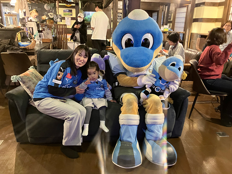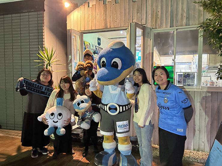 お店に入ると壁一面にフロンターレグッズが! これにはふろん太のテンションもMAXに! フロサポの皆さまとたくさん写真を撮ってご機嫌の様子でした!