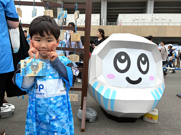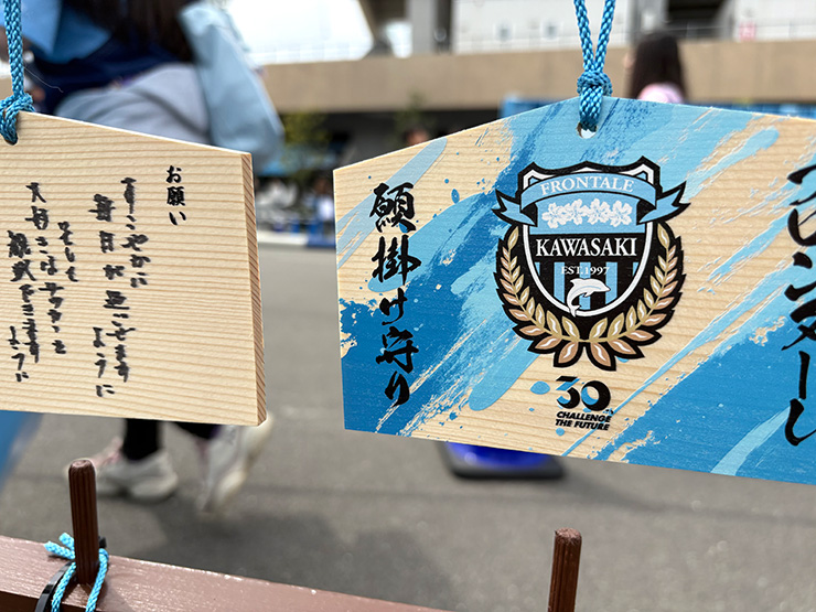 今回のイベントでは、フロンターレデザインの願掛け守りに、各選手、サポーターが各々の願いを書いて飾りました。