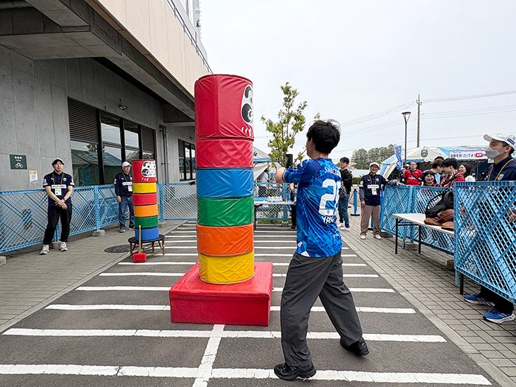 野球場広場の中心にそびえ立っていたのは、高さ2.5mの巨大だるま落とし。