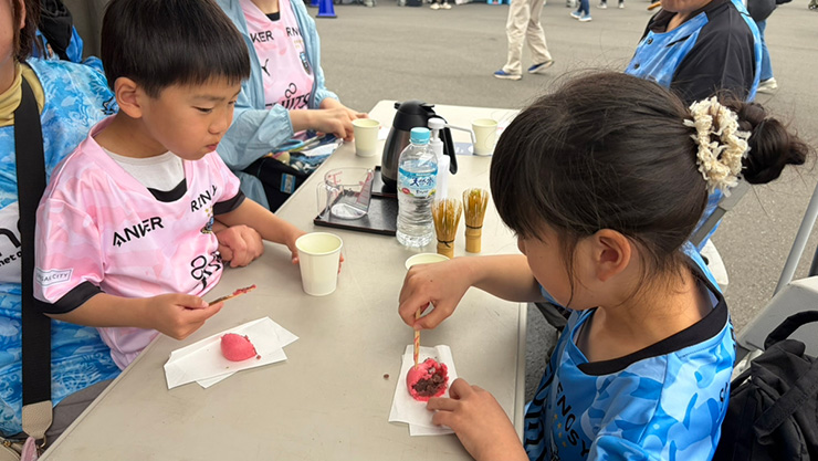 最後は、自分で点てたお抹茶とサポートショップ「喜久屋」さんの赤い薯蕷饅頭を一緒に楽しみました。