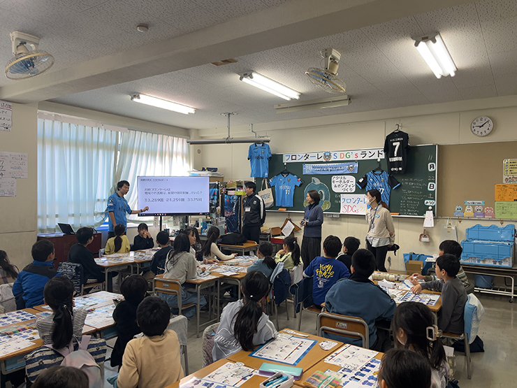ワークショップを始める前には、川崎フロンターレが取り組んでいるイベントについて紹介しました。「フロンターレの地域活動は、1日に約10件ほど行われているんだよ」と説明すると、児童からは「そんなに!?」と、とても驚きの声が上がりました。
