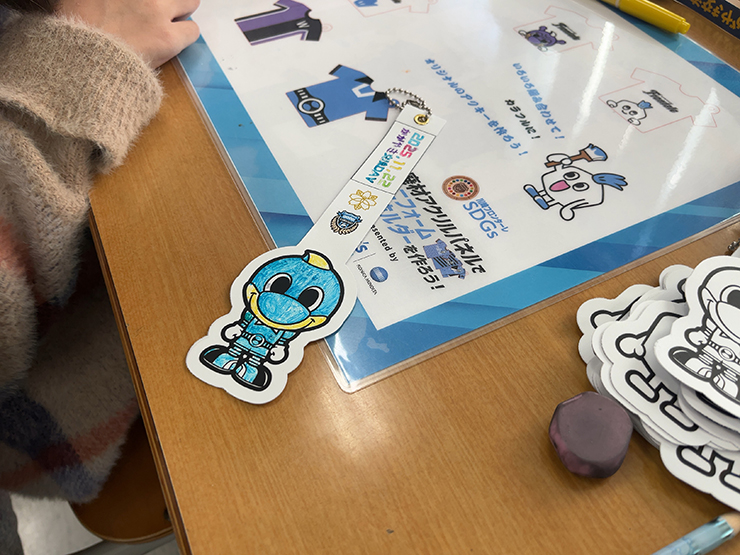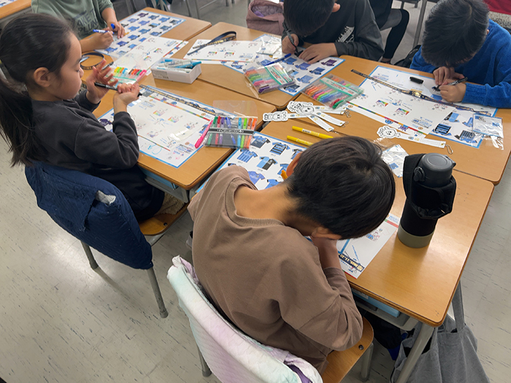 作業の説明が終わると、まずはキーホルダーづくりに挑戦! 「かがやき交流DAY」限定で下作延小のマスコットである「きずな」と「さくら」を使用した絵柄もあり、児童たちは思い思いのデザインを描いていました!