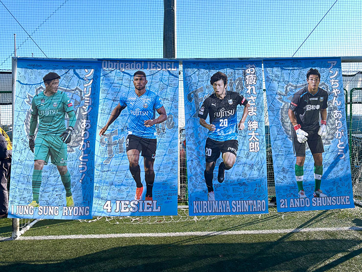 写真:サポーター主催のお別れ会、ソンリョン選手、ジェジエウ選手、車屋選手、安藤選手にサポーターみんなで書いたタペストリーをお渡ししました!