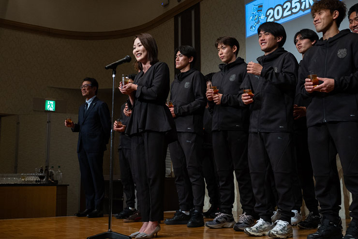 そして乾杯は、例年ボランティア活動をスポンサードいただいているイッツコム様より、応援番組「SukiSukiフロンターレ」MCの阿井莉沙さんにご発声いただき、納会がスタート。