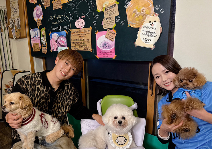 山本選手も愛犬家ということで、宮前区神木本町にあるCafe Pecoさんのご協力のもと、山本選手の愛犬 ネムちゃんとティナちゃん、そして私の愛犬 茶々も一緒に収録をさせて頂きました! 山本選手の愛犬はとても穏やかで収録中もお利口さんに参加してくれました☆彡