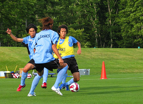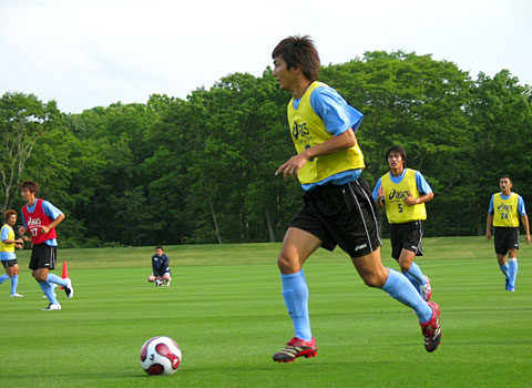 トレーニングは15時30分から。15時ごろ、選手よりも一足早くグラウンドに入ったスタッフチームが準備を始めました。いつ来ても最高のグラウンドコンディションとグラウンドロケーション!トレーニングの準備をしながら「ここのピッチはいいよね〜芝生はそのへんのスタジアムよりもよっぽどいいね」とプレーヤーからコーチの立場になった今野コーチが話していました。「選手のときもこのグラウンドはトレーニングに取り組みやすかったんだよね。周りが林に囲まれていて静かだし、グラウンドも2面以上取れる余裕があるし、何しろ芝がいい。ここでトラップミスしたら恥ずかしいよね… いつもここできっちりトレーニングできてきたから、後半戦を戦えたんだと思うよ。今回もきっちりやっていかないとね!」