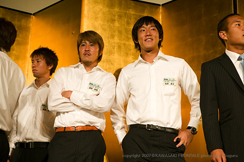 ホテルに到着した選手たちは、まず控室で腹ごしらえ。その後「ネクタイちゃんとできるてる?」「スーツの前はとめて」とお互いで身だしなみチェックを終えて、さぁいよいよというところで何人もが「トイレ行ってくる」…と相変わらずバタつきましたが、次の瞬間全員がキリッとした表情になり、いざ会場へ。