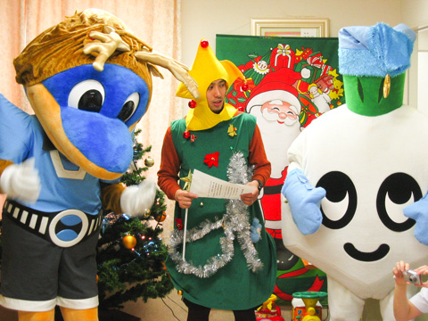 いつものことですが、ブルーサンタ・もみの木・ふろん太・ピーカブーを見た瞬間の「うわぁ〜」という何とも言えない嬉しそうな子供たちの顔を見る瞬間が一番。リハーサル段階でかなり緊張していたキクも、その笑顔を見たからか試合中とはまったく違う満面の笑み。おっきな声でみんなで歌を歌い、楽しんでくれたと思います。