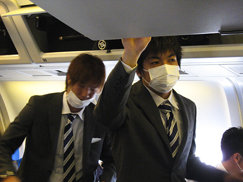 無事に飛行機に乗った選手達。多分、同乗していた一般のお客さん達からすると、「異常な集団が来た!」と思われたかもしれません。"お揃いのスーツにお揃いのマスク"モバフロでもちょこっと触れていますが、メディカルスタッフの指示により、前回のキャンプから飛行機移動の際にはマスク着用を義務付けています。