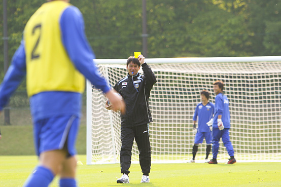 1対1がベースのトレーニングなので、選手たちもじょじょに白熱してきます。迫力のある攻防に見学していた地元の子供たちも「すげぇー!」と驚きの声をあげていました。かといって熱くなりすぎると、ファールになってしまいます。すると、セキさんがおもむろにポケットに手を入れ、イエローカードを提示。そんな小物まで用意していたんですか、セキさん。芸が細かいです。