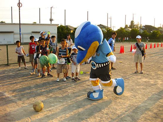 フロンターレも負けじと、盆踊りのやぐらのすぐ近くでシュートチャレンジを実施。小学生の男の子たちを中心にすぐに長蛇の列が出来ました。もちろんふろん太も場内を回って挨拶回り!?に大忙し。あちこちで写真撮影やうちわへのサインをせがまれるなど、こちらも人気でした。