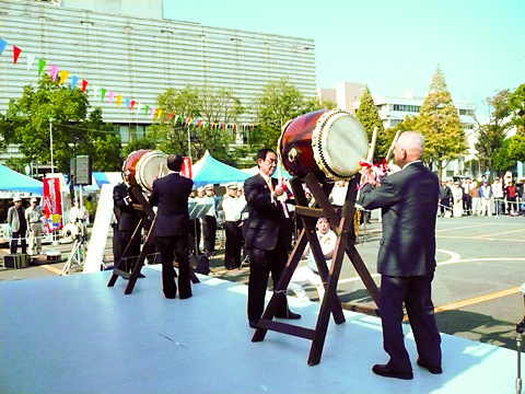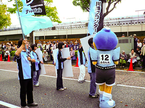 さて、お祭ですが例年通り多くの人で大賑わい。開会式は平日にも関わらず人だかりができていました。この開会式ではふろん太の紹介をしていただき、市制記念試合の「マスコットまつり」の再現!?と川崎市のマスコットたちが大集合。ふろん太は久しぶりの再会で交友を深めていました。この日はふろん太の練り歩きで終了。後日、1日の参加は大忙し。朝一番まず、パレード参加。去年は、署名活動のPRと一緒に歩きましたが、今年はスマイルスタジアムのサポーター有志が参加してくれ、それと去年からのつながりで洗足学園音楽大学のバトン部「RIOT」の皆さんと試合告知のPRをしながら歩きました。沿道には多くの人がいて「今度等々力に行くぞ〜」など声を掛けていただき、いっぱい声援をもらいました。
