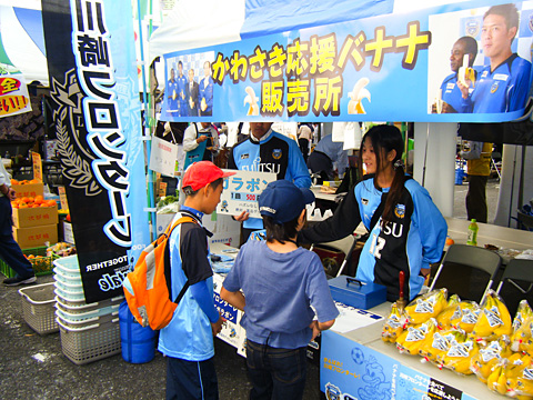 でも毎年参加させていただいておりますので、今年はフロンタウンのスタッフが元気に参加させていただきました。しかも、「かわさき応援バナナ」の販売においてご支援いただいております、川崎中央青果株式会社様と同じブースでの参加です。