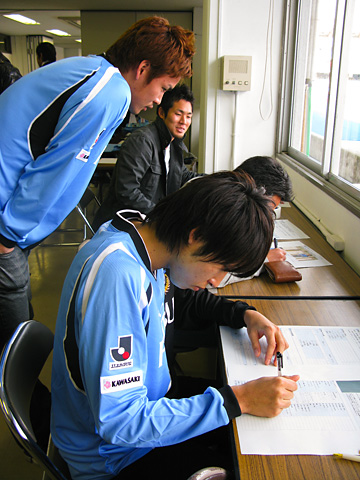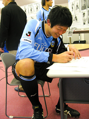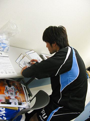 と、撮影が順調に進んでいる頃… フロンターレの儀式のひとつ。早速大量のサインを書かされている、いえ!自ら書いている!のはコミこと小宮山尊信選手。あまりの多さに混乱し、「タイトル!」と書くべきところ「タイトレ!」と書いてしまい、後からみんなで笑いながらコミに微修正してもらったのは内緒です(ここで言ってしまってますが)。