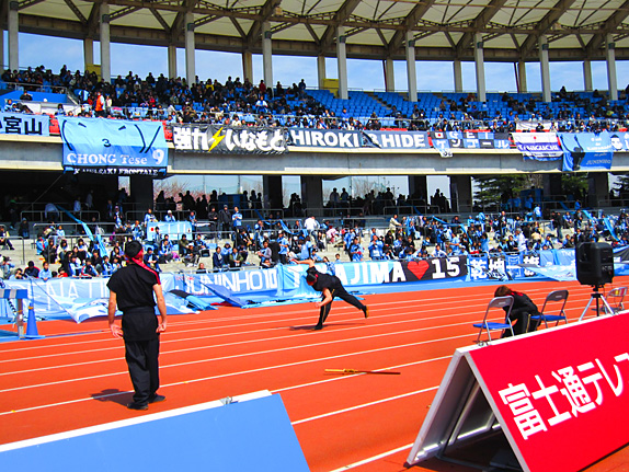 等々力陸上競技場のルールとして、「席ツメTime」というものが設定されており、キックオフ20分前には自分の席に戻っていただいています。一旦自分の席を確保して場外のフロンパークに遊びに行った人も(再入場可能時間はキックオフ30分前まで)、売店で買い物を楽しんでいる人もすべての人が対象です。その席ツメTimeにスタンドで席つめの協力を呼び掛け、一人でも多くのお客様に席をご用意するのが席ツメ隊の使命です。これまでの活動よりさらに席ツメTimeの認知を拡大しようと、席ツメ隊は試合前にフロンパーク内後援会テント前とグラウンドレベルで去年までにないパフォーマンスで席ツメTimeの宣伝をしています。見たことある方もまだパフォーマンスを見たことがない方も是非足を止めてパフォーマンスを見ていってください。剣舞にアクロバット、そして「席」を絡めたちょっとしたコミカルさもアクセントになっています。是非一緒に手拍子をたたいてパフォーマンスを楽しんでくださいね。