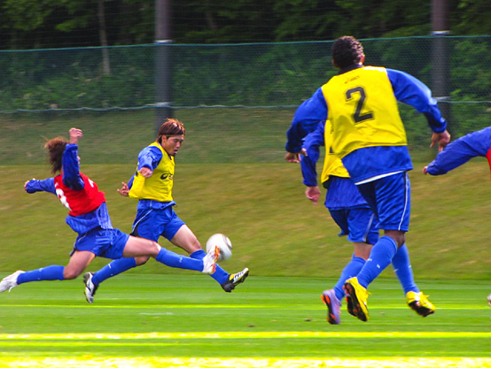 午後は30分×2本の紅白戦が行われました。強い雨が降りしきるスリッピーなピッチの中で二組に振り分けられたグループ。公式戦さながらの気迫のこもったプレーを見せてくれました。