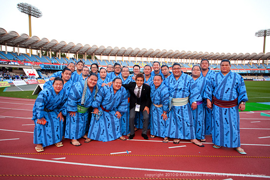 今年は、5月1日vs湘南ベルマーレ時の「イッツ ア スモウワールド2010」やファン感謝デーのステージで選手達とコラボした「恋愛レボリューション」が印象的でしたが、選手達が春日山部屋へ朝稽古を視察に行ったり、力士達が個別にホームゲームを観に来たり、力士との交流は増え、距離感も近くなっています。