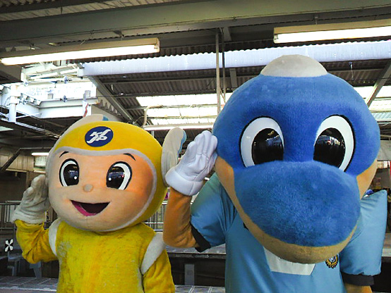 しかしキャンペーン中は駅利用者に対して積極的に声をかけ、チラシを配っていました。そんなイガを一目見ようと駅にはたくさんの人が集まりましたが、イガは一人ひとり丁寧に対応していきました。そんなイガの協力もあってか予定していた時間より早く配り終え、無事にチラシ配りも終了。最後はふろん太くんと神奈川県警マスコットのピーガルくんの3人で一緒に敬礼のポーズをとっての記念撮影でキャンペーンは終了しました。