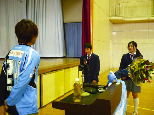 まだ緊張してるかな〜と思ったスタッフでしたが、ここで見事な雰囲気を作ってくれたのが、平中学の生徒の皆さん。この会ですが、企画から本番の演出や進行まですべて平中学の生徒さんで進めていたんです。「小林選手はどの本から読み始めましたか」「おすすめの本を教えてください」から、少し主旨からはそれますが「何が好きなんですか」「いつも行くお店を教えてください」など、川崎にまつわることからユウのプライベートなことまでも聞かれましたが、ユウも「う〜ん…、どこだろうなぁ」と真剣に考え込んでしまうことも。彼の人柄の良さが垣間見える瞬間でもありました。