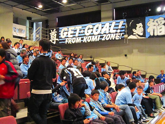 そんな今年を締めくくる活動が、先日のベガルタ仙台戦で行なったパブリックビューイング(PV)です。フロンターレのシーズン最終戦を、迫力の大画面で区民皆なで応援しよう!ということで、地域情報誌や区HPなどで告知を麻生区内のみに限定して募集しました。