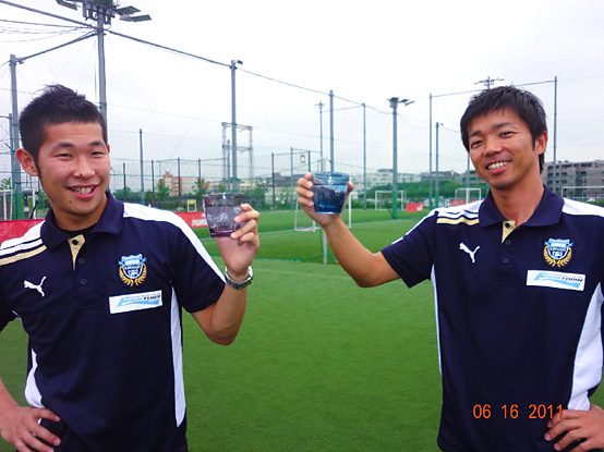 フロンターレサポーターの皆様も、この切子グラスで、ぐいっと一杯、暑い夏の夜を彩ってみてはいかがでしょう。贈答用にもお勧めです。フロンタウンの美しい人工芝の上でしばし語らいながら休憩する二人。切り子グラスで飲む水の美味しさはまた格別です。