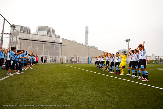 今日も50人ほどのサポーターの皆さんがかけつけてくれ、選手の家族・応援に来ていたU-10の選手たちとともに熱い応援をしてくれました。選手たちも「バディーもマリノスも応援がすごかったけど、うちはもっとすごかった」と喜んでいました。高?監督からも選手たちに「トップチームだけではなく、こういうジュニアの試合にもわざわざ応援にきてくれている。これはすごいことだ。君たちはお父さんやお母さんだけではなくて、大勢の皆さんの力に支えられているから、サッカーができているんだぞ。フロンターレというチームはそうやってなりたっている。自分たちのためにも、支えてくだる皆さんのためにも頑張らないとな」と話していました。
