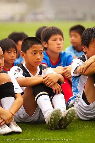 そのころ、すでに試合前のミーティング中だったフロンターレU-12は、高崎監督から「今まで自分たちがやってきたことを信じて思い切ってやってこい」とゲキを受け、ひと足早く全国行きを決め、喜ぶあざみ野FCの選手たちを見て、さらに気合いが入ったようでした。