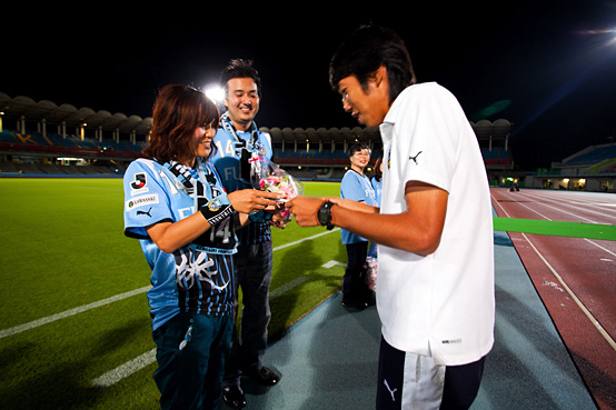 ケンゴがJ1通算200試合、ユウスケがJ1通算100試合出場を達成したことは先日、ご報告しましたが福岡戦の終了後、サポーターを代表して直接、二人にお祝いの言葉や花束を渡す「お花を持って話し隊・祝い隊」を実施しました!