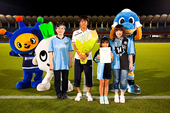 皆さん始めは、リハーサルしていたにも関わらず緊張していましたが、さすがはケンゴ!自分から話し掛け皆さんの緊張をほぐしつつ楽しく談笑していました。参加者の皆さんは立派な花束を用意して、思い思いのプレゼントを渡していましたよ。ある一組のお子さんは緊張してどうしてもケンゴに話し掛けられなかったのですが、お母さんが「引っ込み思案の子どもなんですが、初めて自分から欲したのが、3月3日の誕生日プレゼントにシーズンチケットが欲しい!って言ったことだったんですよ。びっくりして…、息子がそんなことを言うので私も付いて観戦に行っていたら…、今では家族で応援しています!」そんなことを聞いたのでケンゴも一生懸命話し掛け続け、最後は二人で握手をしていました。