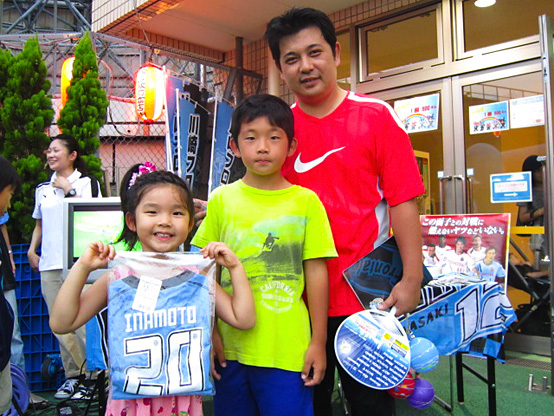 日中のあれだけ照っていた太陽が雲に隠れ、今にも降り出しそうな空模様に。案の定、降ったり止んだりの天候の中でしたが、そんな天候を諸共せずスタート!!フロンターレブースは、子どもに大人気のキックターゲット、グッズガラポンを実施。そしてふろん太が参加し、場を盛り上げます!!