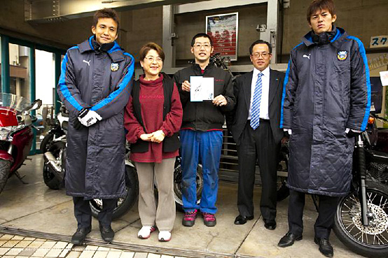 「地域の人たちから激励の声をかけられ、みんなのフロンターレであることを強く感じました」とリキ、「みんなから、頑張って!タイトル頼むよ!と言われ身が引き締まる思いになり、期待にこたえるためにも頑張りたい」とサネ。チーム始動に先立ちたくさんの激励を受け、気持ちの準備もできたようです。実は都合により昨年お伺いできなかった中丸子ですが、手作りポスターでのサイン会の告知や挨拶回りの先導など、いろいろとご協力ありがとうございました。今年も応援よろしくお願いします。