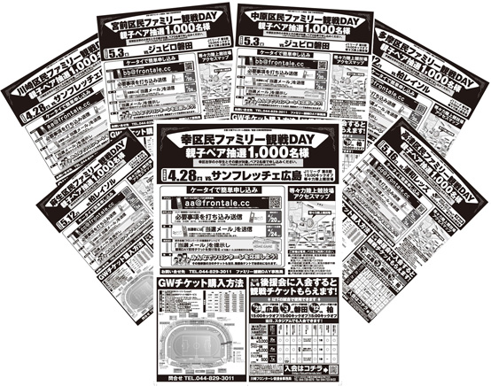 裏面には川崎市にある川崎区、幸区、中原区、高津区、宮前区、多摩区、麻生区の7つの区に合わせて、それぞれ異なる内容が掲載。そして区民ファミリー観戦DAYと題して、親子ペアでチケットが当たる情報も掲載されていますので、こちらもお見逃しなく!!