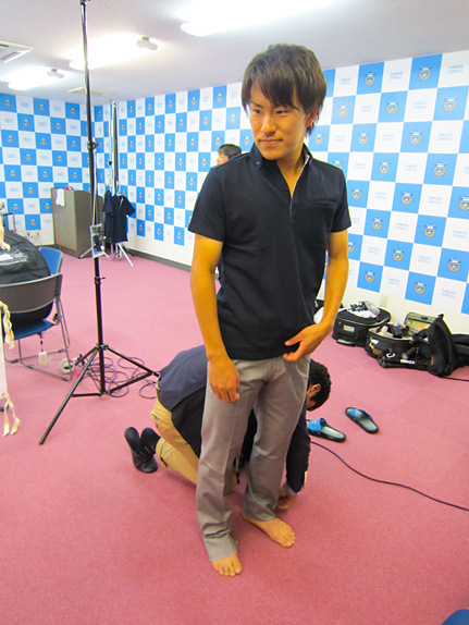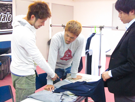 そして、今年はどの選手が選んだかというと、今年のオフィシャルスーツをセレクトした小宮山尊信選手と田中裕介選手の二人。普段からチームの中でもお洒落と呼び声の高い二人にセレクトしてもらいました。ORIHICAさんも交え、今年のトレンドを聞いたり、選手の要望や昨年着用していた夏服を参考にしながらセレクトしていきます。決定していく上でポイントになるのは“着やすさ”です。選手は体が資本なのでデザイン性が高くても着にくかったり、着て疲れてしまっては本末転倒になるので…。もちろんORIHICAさんにそんな商品はありませんが、重要なポイントなんです。