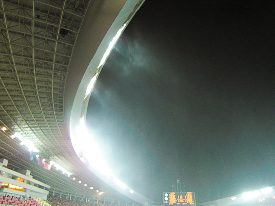 お腹も物欲も満たされたところで、長居スタジアムへ向かいます。到着した時は、心配された雨は降っていませんでしたが、風がすごく強く歩いていても飛ばされそうになるくらいでした。雨も後半の終盤に10分程度降ったくらいで、試合終了後にはやんだので、帰るときも濡れずにすみました。