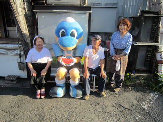 下麻生にある精肉店、美笠屋精肉店さん。到着するやいなやお母さんが「スイカ食べるでしょ?」とスイカを切って待ってくれてました。すごくアットホームなお店なので、スイカをみんなで食べながらふろん太も落ち着いちゃった様子でした(笑)