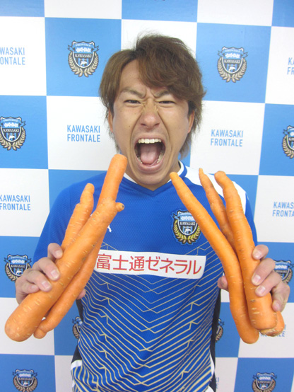 また、ドールさんのニンジンの美味しさを皆さんに伝えるために、若手選手が生活している麻生区の「青玄寮」で特製ニンジン料理を作って試食会を行いました!今回は、僚太、宏矢、ビュンジュン、宏希が参加!みんなニンジン大好き!かと思いきや、僚太と宏希はニンジンがちょっと苦手。試食前は不安そうな顔をしていましたが、青玄寮のスタッフの皆さんが腕によりをかけて作ったニンジン料理を目の前にすると「美味しそう!」と光が見え始め、いざ食べてみると「美味しい!これならニンジンが苦手な人でも食べられる!」と大好評!