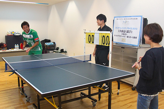 本企画を実施するに辺り、麻生スポーツセンター様のご協力のもと、麻生グランドにて選手たちによる卓球大会が開催されました。優勝すると実施日当日にヨシトのパートナーになれる権利ということで若手中心に大島選手、棗選手、福森選手、登里選手、風間宏矢選手、安柄俊選手、新井選手の7人が参加し、白熱した卓球大会が繰り広げられました。今大会で優勝したのはアキト(福森晃斗)。「高校の時に選択体育の授業で卓球やっていたんですよ!!」というキャリアは本物でした。その他の選手も競技は違えど、スポーツのプロ選手であり、やはり運動神経が優れていることを再認識させるスキルで決勝のフク(福森選手)とコウヤ(風間宏矢)の決勝は見応えのある試合でした。フクの優勝により、ヨシトのパートナーは決定した訳ですが…、この後どうしても俺が行きたいという強い気持ちから、同行することになったのはショータ(新井章太)に決定。フクは最後まで納得が言ってなかったようでしたが…。