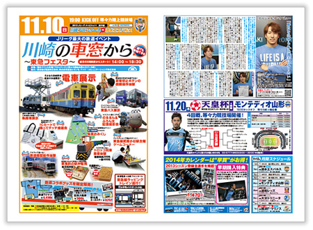 裏面を覗くと、11月24日(日)にトップチームの練習場でもある麻生グラウンドで開催される「第4回あさお青玄まつり」の情報を掲載。今年もトップチームの選手が参加するのはもちろん、様々なイベントをご用意しております。さらには2014年の後援会会員を現在募集中です!現在、お得な早期入会キャンペーンを行っていますので、こちらもお見逃しなく!!その他にも川崎フロンターレU-18が参戦しているプリンスリーグ関東2部ホーム最終戦の情報や、11月20日(水)に行われる天皇杯4回戦vsモンテディオ山形戦、さらに2014年カレンダーなどグッズ情報も掲載しています。