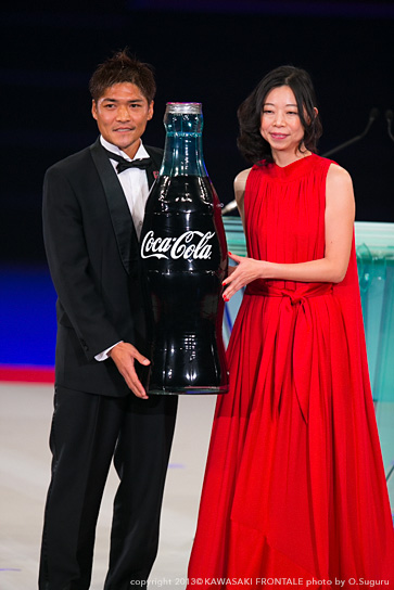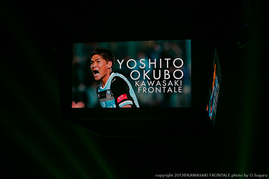 そしていよいよ得点王の表彰です!フロンターレサポーターが数多くいる場内からの登場で、場内は大いに盛り上がりました。そんな最高の雰囲気の中、ヨシトは少々緊張気味…。一緒に向かっている車の中から「みんなの前で挨拶するんだよね?何言えばいいかな…」と挨拶を考えていたヨシトでしたが、スピーチでは「この賞を取れたのも、監督をはじめコーチ、スタッフの皆様、ファン・サポーターの皆様、そしてチームに関わった全ての方に感謝したいと思います。ありがとうございます。そして、今年移籍1年目でいろいろと大変な中、僕を支えてくれた家族に感謝したいと思います。ありがとうございます。これからはこのような素晴らしい賞に恥じないように、もっともっと努力して素晴らしいプレーを見せられるようにしていきたいと思います」と見事な挨拶をしてくれました!!