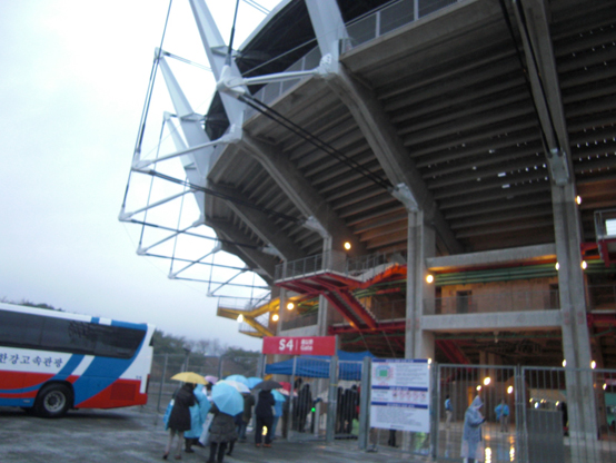 ホテルから専用バスに乗り、約1時間後には蔚山のスタジアムに到着。スタジアムは2002年のワールドカップスタジアムでもあるので、1階の前から10列以降は屋根があって、応援する時も濡れずに済みました。こういう時は屋根があるスタジアムはいいですね。
