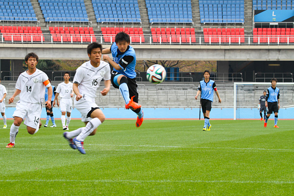 フロンターレは立ち上がりから積極的な攻撃を見せ、早々に試合は動きます。8分、左サイドのFW岡田優希選手からMF牧寛史選手へとつながり、自らドリブル突破でペナルティーエリアまで進入し、相手GKの動きをよく見て落ち着いてゴールへ流し込み、幸先よく先制点を奪います。