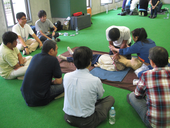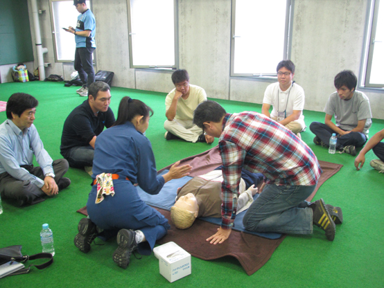実践では、5グループに分かれて、心肺蘇生法とAED(自動体外式除細動器)取扱を実践しました。