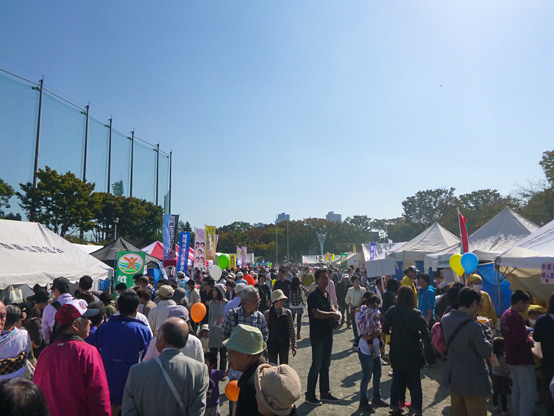 まずは、なかはら区民祭のご報告。なかはら区民祭は、ちびっこサッカーひろば、お祭りひろば、模擬店ひろばなどのコーナーに分かれており、等々力緑地一体を使った大規模なお祭りです。天候も良く、たくさんの来場者で賑わっていました。