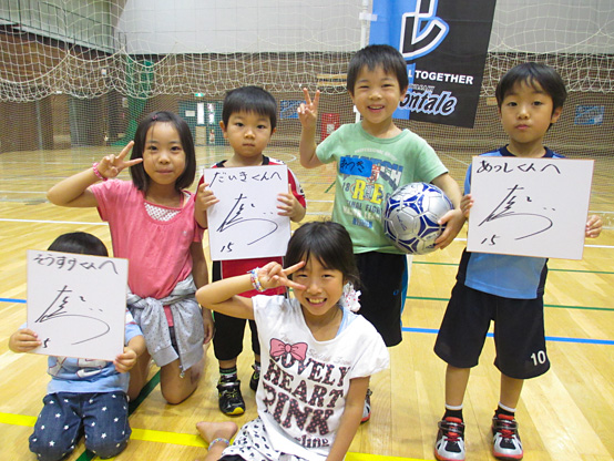 次に体育館で行われたサイン会も、一般受付は先着50名限定ということで早くから大勢に並んで頂き、ありがとうございました。これにはフットサル教室に参加の50人の子どもたちも参加。一人一人優しーく名前を聞いて、丁寧に〇〇くんへと書くあたりもさすがイケメンぶり発揮です。